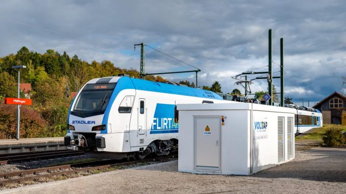 UPDATE 19/03/2022 – Van 14 oktober tot 21 oktober vorig jaar (2021) werd het prototype van een VOLTAP-snellaadstation voor batterijtreinen, ontwikkeld door Stadtwerke Tübingen GmbH en Furrer+Frey AG, onder reële omstandigheden getest in het Duitse station Ammerbuch-Pfäffingen(Baden-Württemberg). Hiervoor leverde de Zwitserse fabrikant Stadler gedurende een week een accutrein. De resultaten waren veelbelovend en zouden het mogelijk moeten maken om batterijtreinen over langere afstanden te gebruiken omdat zij tussendoor bij VOLTAP tankstations kunnen worden opgeladen. Snelladen gebeurt eenvoudigweg terwijl passagiers uit- en instappen op een station. Nina Guckes en Dr. Wolfgang Klebsch van het VDE Verband der Elektrotechnik Elektronik Informationstechnik e.V. bezochten de installatie op donderdag 17/02 (2022). Zij spraken met deze redactie over hun ervaringen met dit snellaadstation. Nina Guckes en Dr. Wolfgang Klebsch zijn ook de auteurs van de studie “Climate Neutral Alternatives to Diesel Multiple Units“.